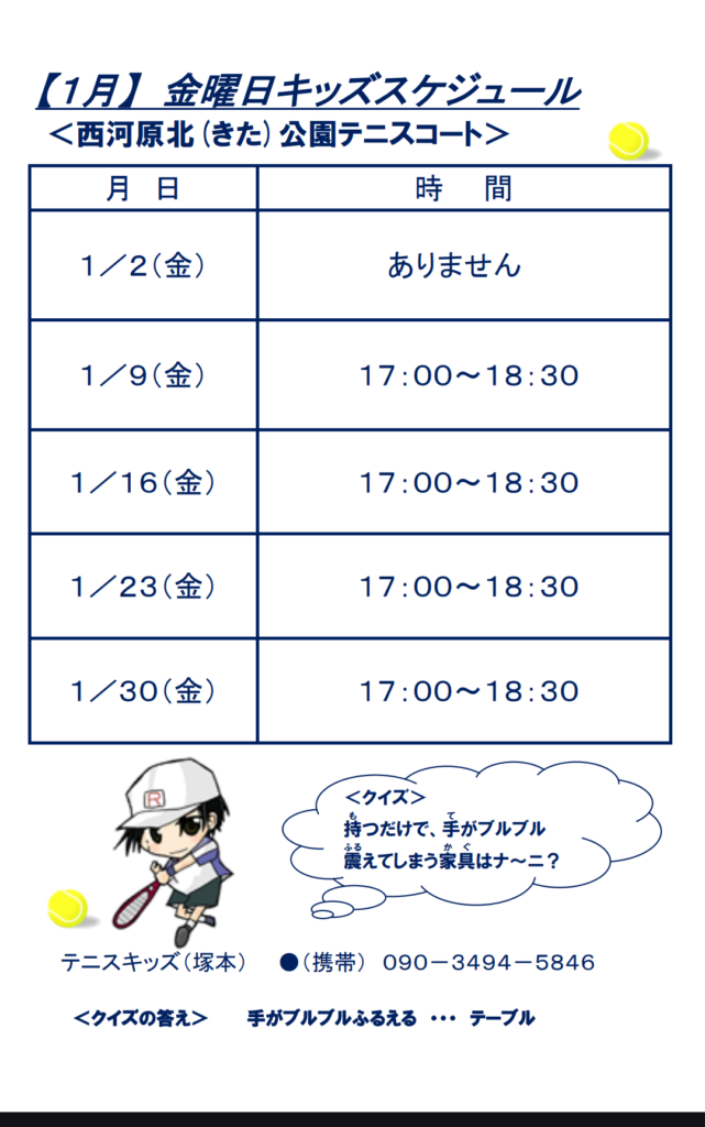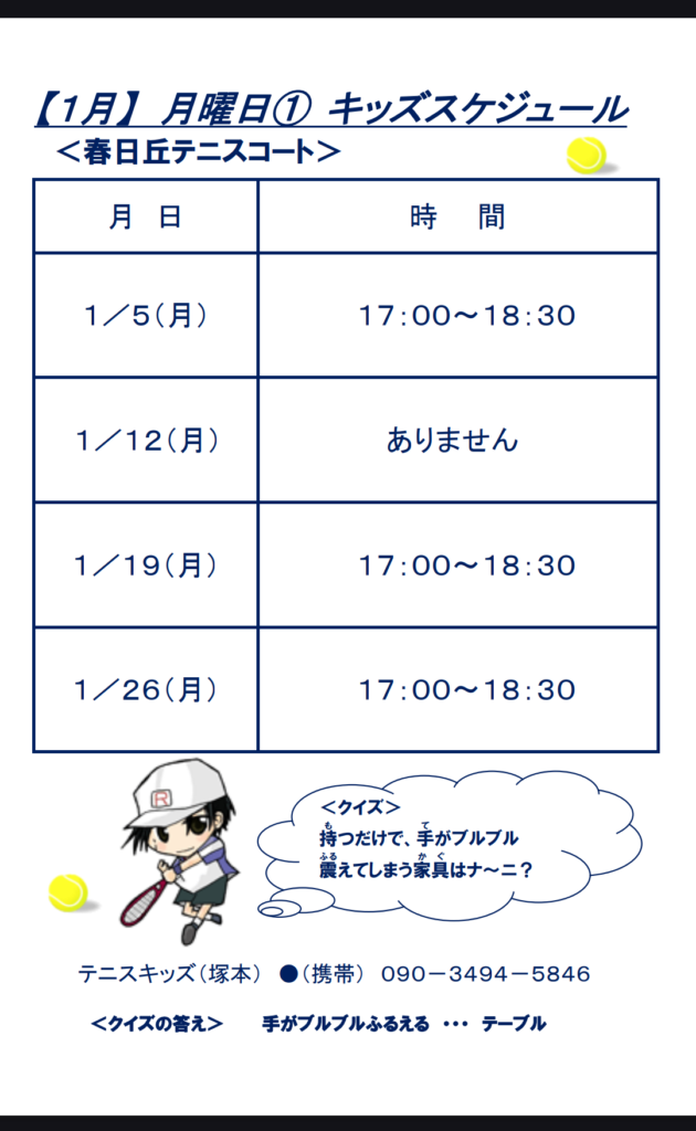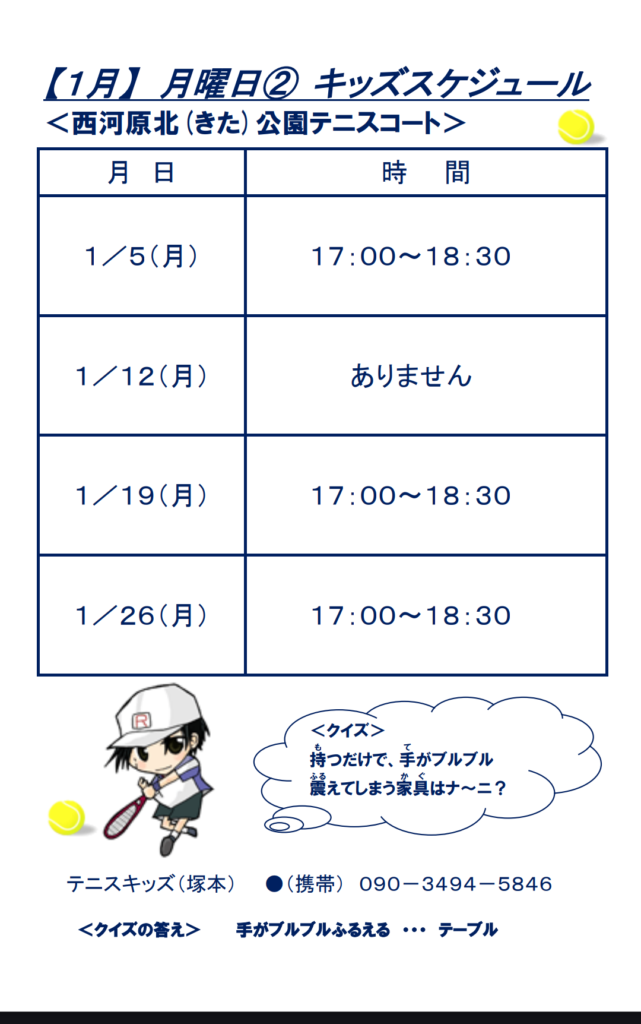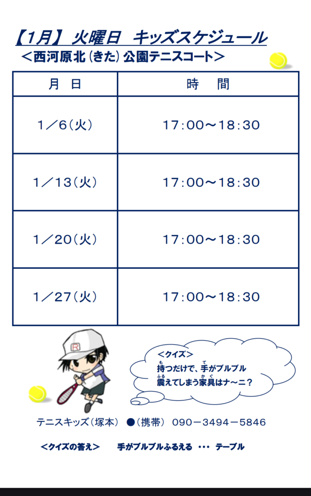 2025-12-24 2026年1月ジュニアスケジュール 2026年最初の月のスケジュール! 皆がどんなふうに年末年始を過ごしたか、聞けるのを楽しみにして練習を始めましょう😁 新年も、よろしくお願いします! Home › ジュニアテニス › 2026年1月ジュニアスケジュール 関連記事 今日もテニスとトレーニング! ジュニア合宿2022!~1日目の晩と2日目~ ジュニアテニスの練習について コーチたちはまだ暑さに参ってます💦 8月ジュニアスケジュール 何の練習?