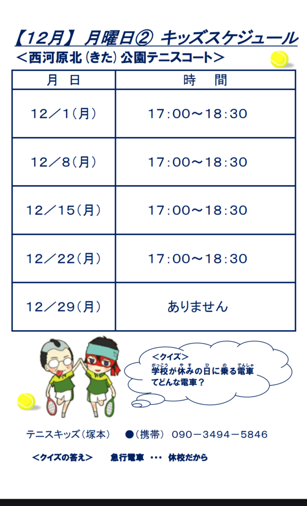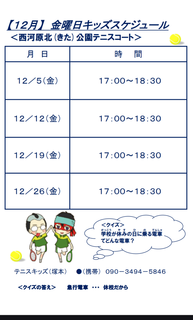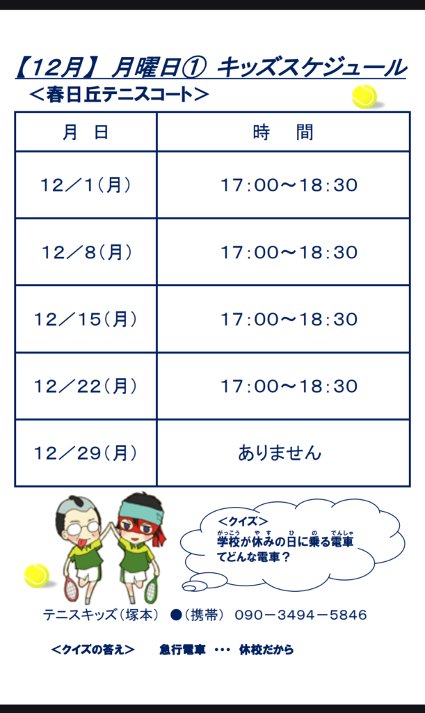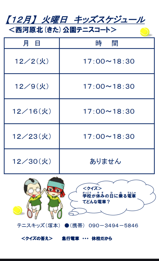 2025-11-27 12月ジュニアスケジュール 2025年も最後の月となります! 12月は毎年恒例のアレがもらえる月🧁✨ 最終週(12月22日〜26日)の練習はなるべくお休みなくご参加ください🙏 12月も、よろしくお願いします! Home › ジュニアテニス › 12月ジュニアスケジュール 関連記事 ジュニア大会情報(申込終了) 今年もきましたこの時期が! ジュニア大会情報(申込終了) ジュニア大会情報(申込終了) 10月のジュニアスケジュール ジュニア合宿2025!